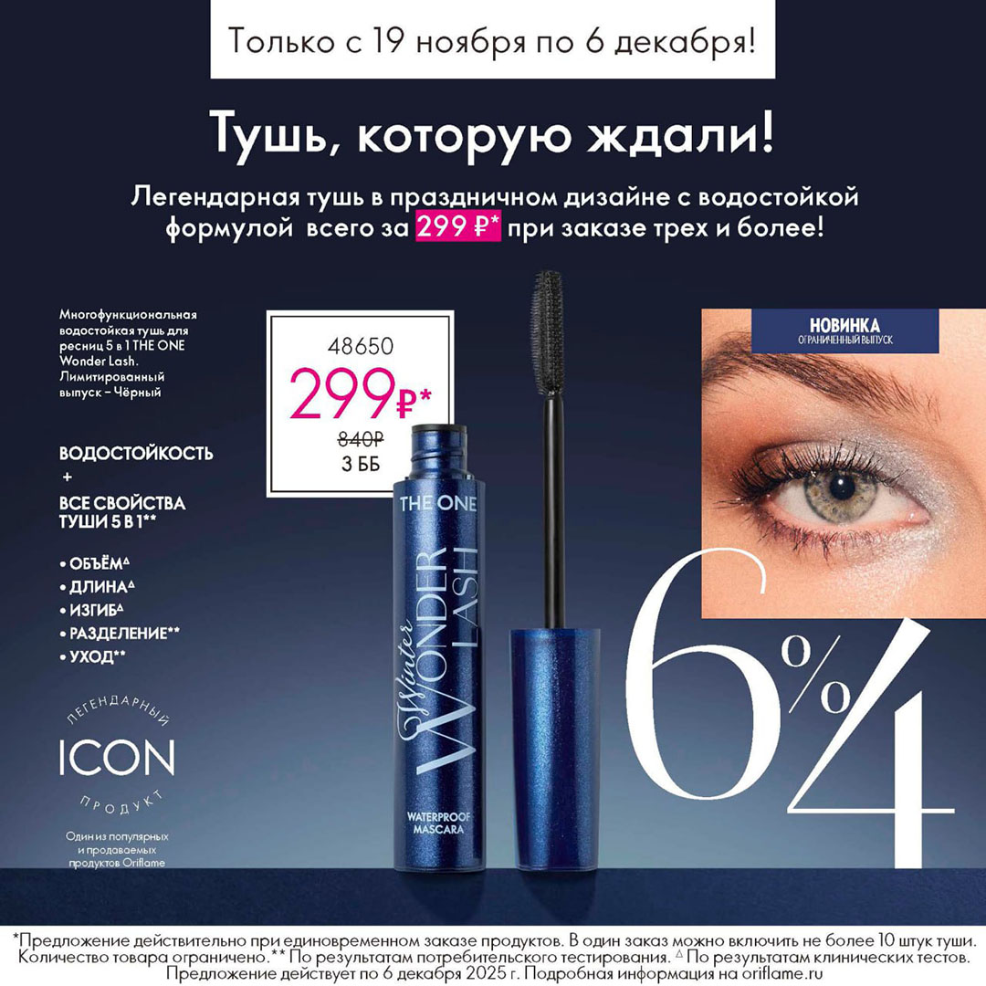 С 19 ноября по 6 декабря включительно при единовременном заказе от трёх и более штук многофункциональной водостойкой туши для ресниц 5 в 1 THE ONE Wonderlash в праздничном дизайне каждая обойдётся вам всего за 299 рублей.