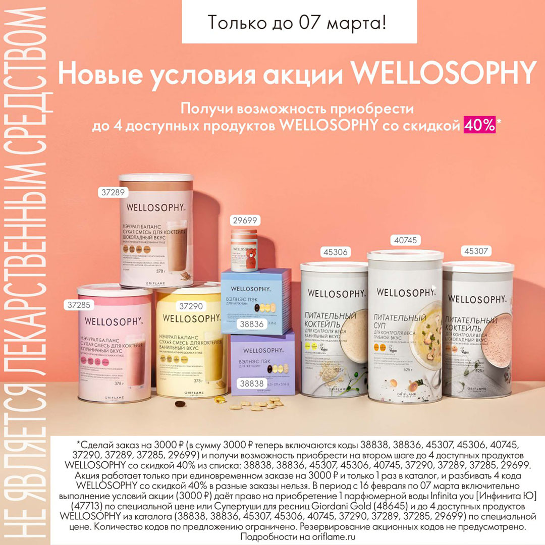 - Выполнение условий акции даёт право на приобретение о специальной цене до четырёх доступных продуктов Wellosophy: 38838, 38836, 45307, 45306, 40745, 37290, 37289, 37285, 29699;
